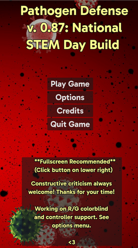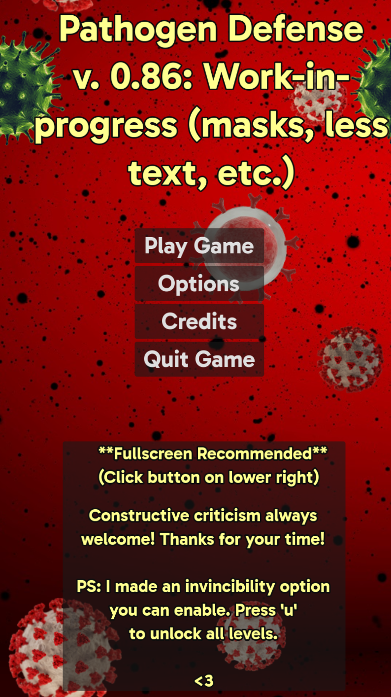 Alpha build of the work-in-progress game. Player controls a B-cell firing antibodies at incoming SARS-CoV-2 and (on normal) Influenza pathogens in a game aimed at 6th-8th graders pairing fun with a little information on how the immune system works.